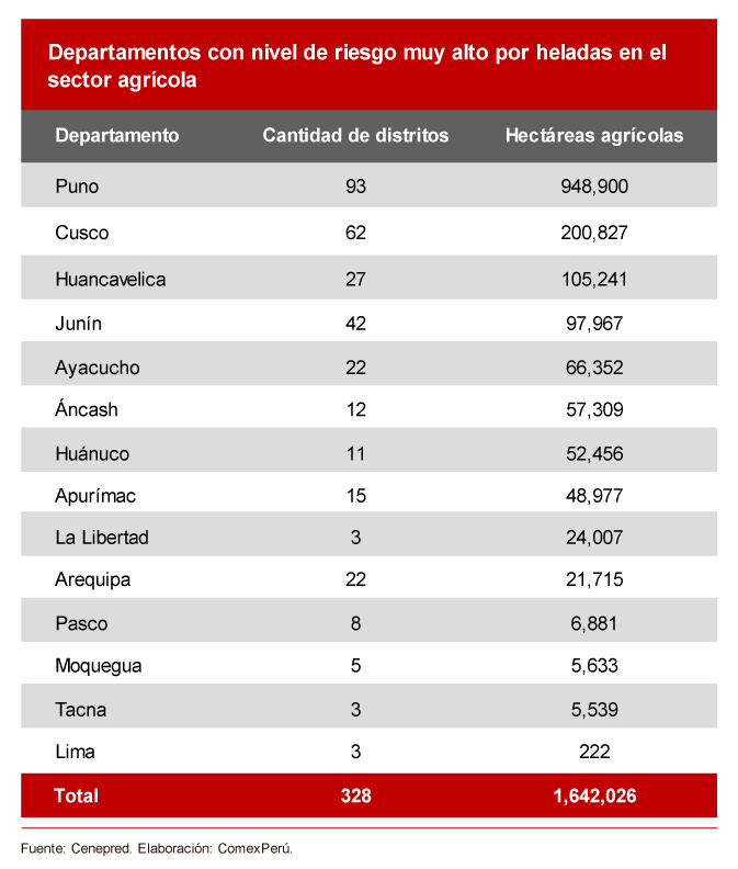 Agencia de Noticias Chiclayo (Brennan Barboza Bravo).- El semanario ComexPerú, en su edición N° 1215 dio a conocer que el informe técnico del Centro Nacional de Estimación, Prevención y Reducción del Riesgo de Desastres (Cenepred) destaca que 1,642,026 hectáreas (ha) de superficie agrícola de 328 distritos enfrentan niveles de riesgo muy alto debido a las heladas; lo cual significa que esas zonas son más propensas a ser afectadas por este fenómeno climatológico, lo que hace que la actividad agrícola sea más vulnerable, señalando que los departamentos con mayor superficie agrícola en esta situación son Puno (948,900 ha), Cusco (200,827 ha) y Huancavelica (105,241 ha).