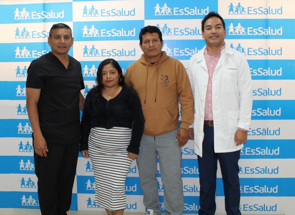 Dr. Marlon Burga Villalobos, Yeny Yesenia Yamunaqué Benites, esposo de la paciente, y el Dr. Kenny Torres Torres (jefe del Servicio de Cirugía del Hospital Heysen)